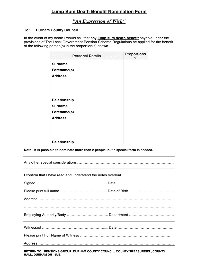 Lump Sum Death Benefit Nomination Form An Expression of Wish” To: Durham County Council In the event of my death I would ask that any lump sum death benefit payable under the provisions of The Local
