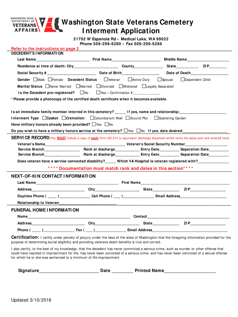 Get the free Interment Application - dva wa