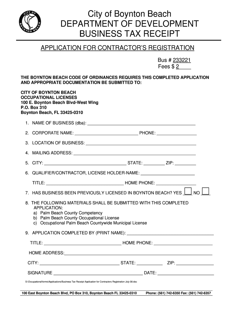 City of Boynton Beach. Department of development. Business tax receipt. Application for contractor s...