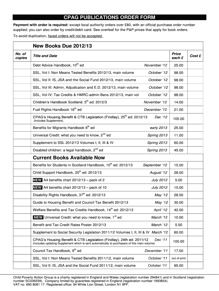 CPA PUBLICATIONS ORDER FORM Payment with order is required: except local authority orders over 80, with an official purchase order number supplied; you can also order by credit/debit card. See overleaf