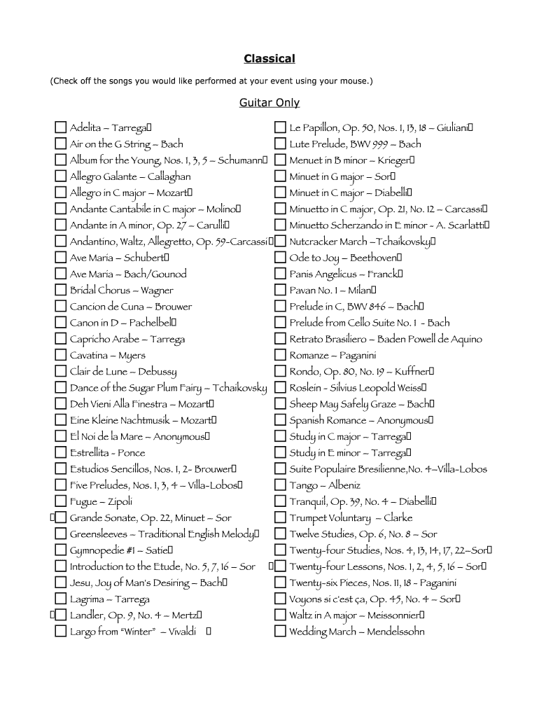 Classical (Check off the songs you would like performed at your event using your mouse.) Guitar Only Adelina Tarred Air on the G String Bach.
