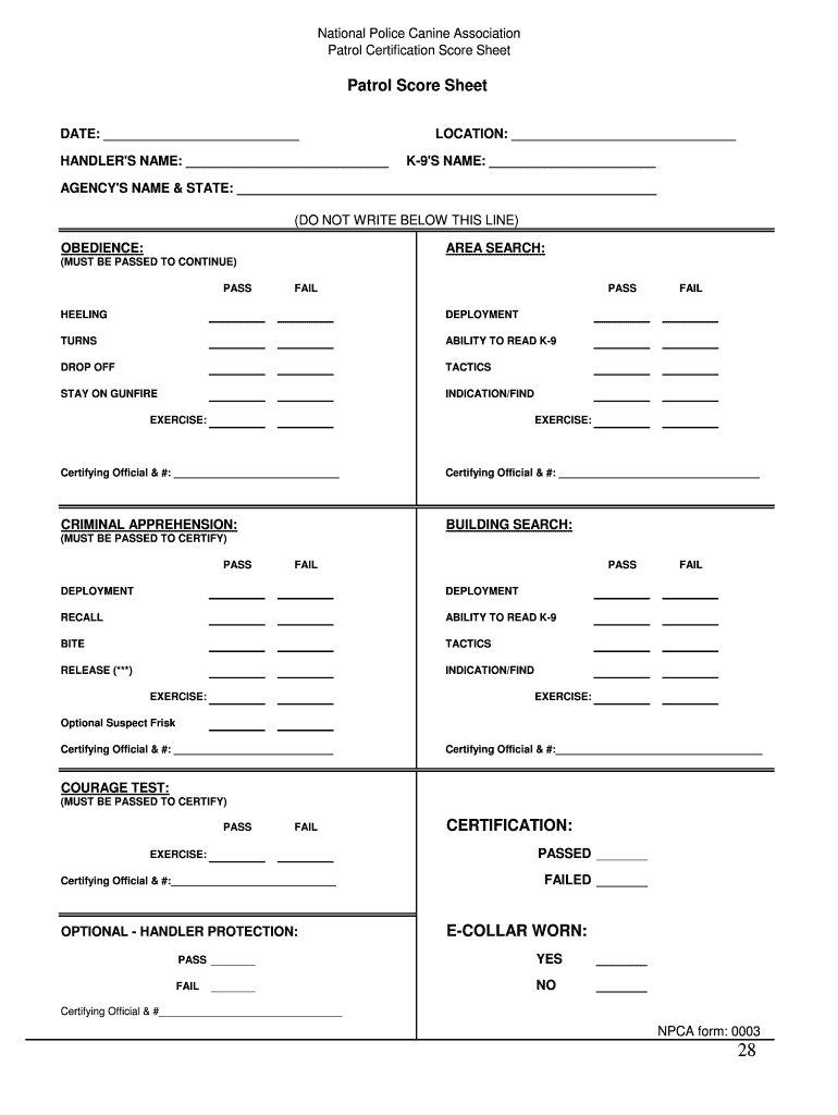 National Police Canine Association Patrol Certification Scoresheet Patrol Scoresheet DATE: LOCATION