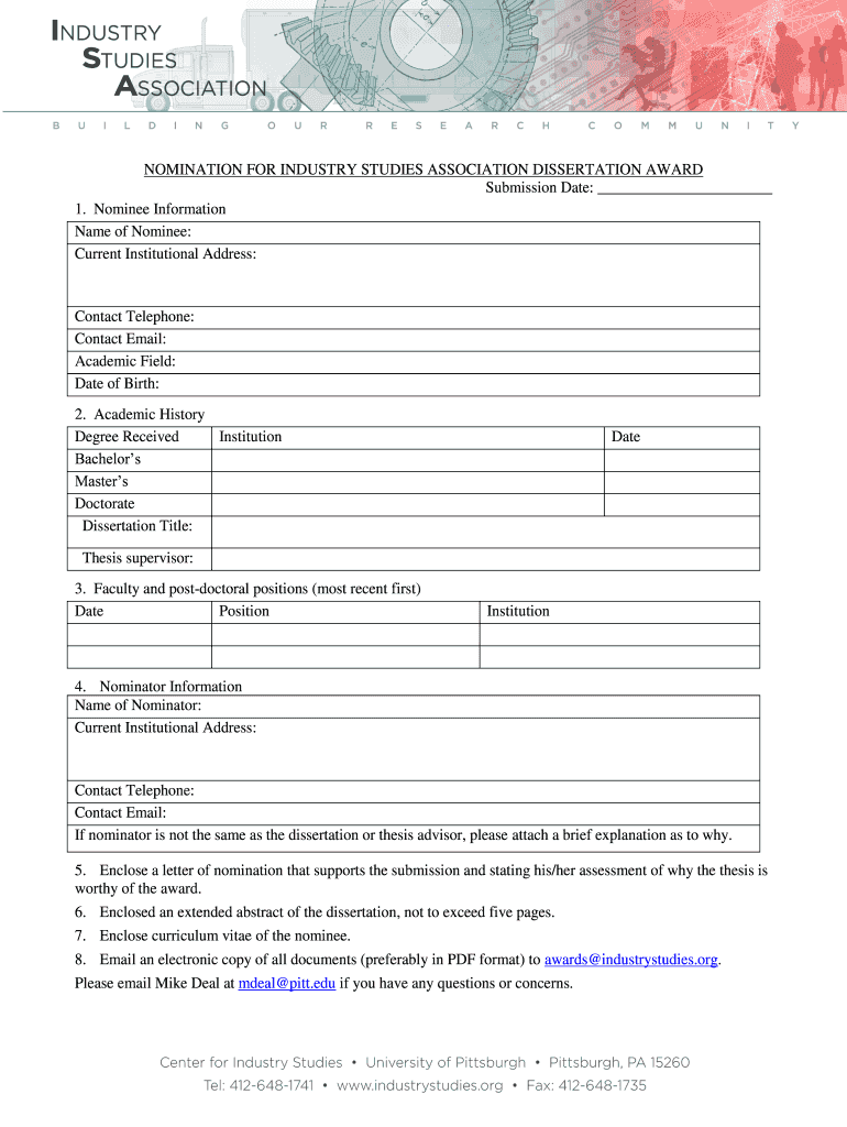 Get the free NOMINATION FOR INDUSTRY STUDIES ASSOCIATION DISSERTATION ... - industrystudies