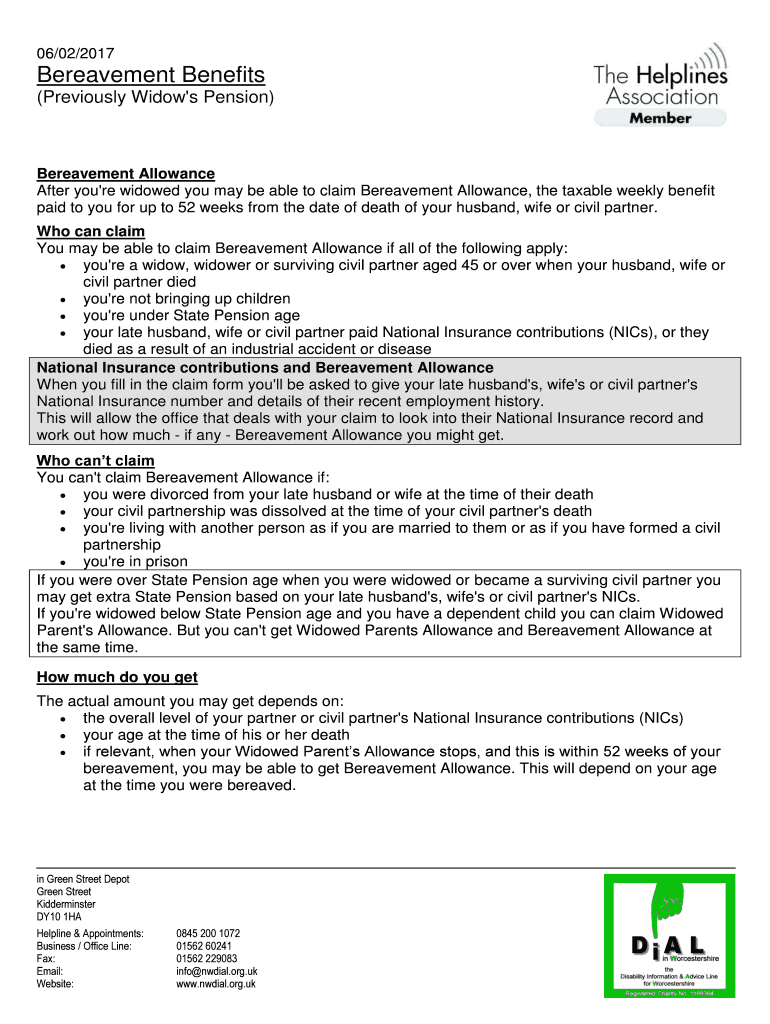 06/02/2017Bereavement Benefits (Previously Widow's Pension)Bereavement Allowance After you're widowed you may be able to claim Bereavement Allowance, the taxable weekly benefit paid to you for up