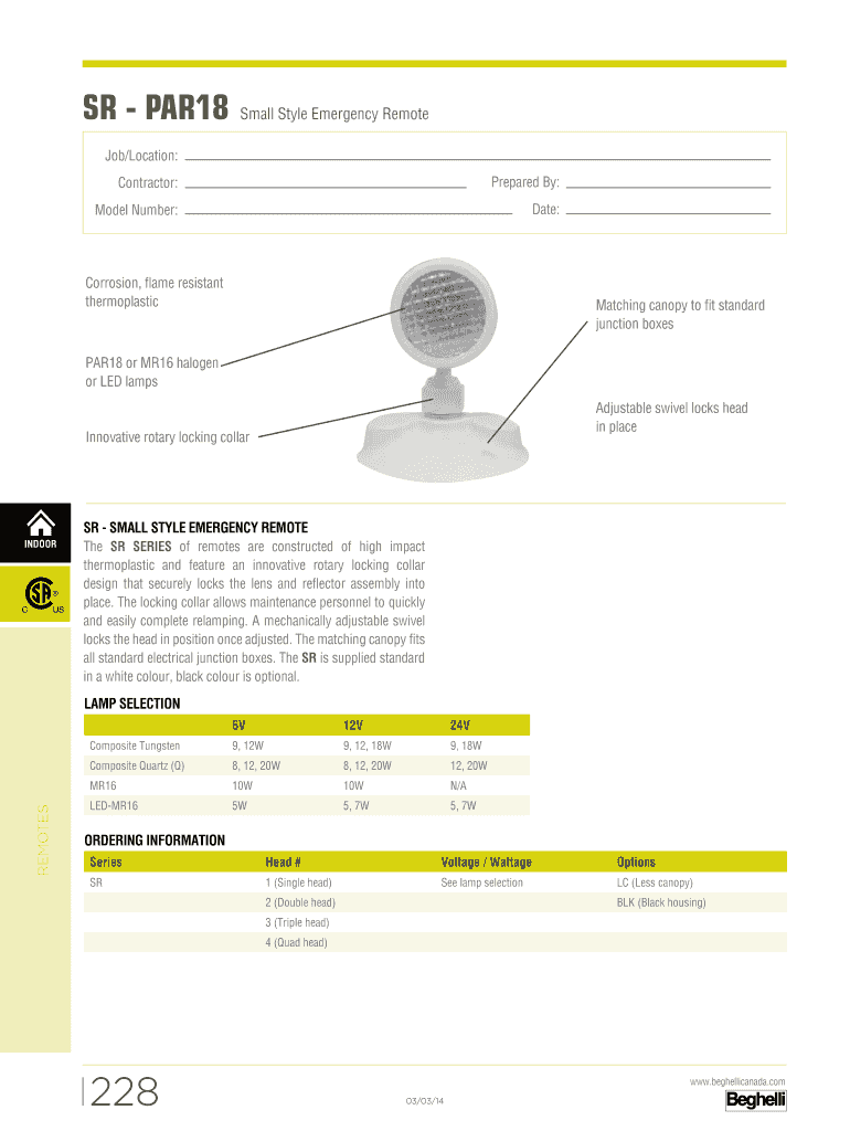228 eellicanadacom remotes location Contractor Model Number Prepared B ate SR — PAR18 Small Style Emergency Remote Indoor LAMP Selection 6V 12V 24V Composite Tungsten ...