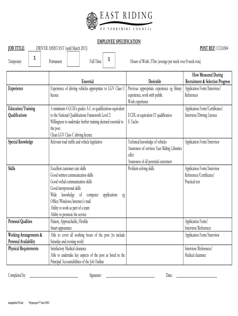 EMPLOYEE SPECIFICATION DRIVER ASSISTANT (until March 2013) JOB TITLE: x Temporary Permanent Experience Education/Training Qualifications Special Knowledge Skills Personal Qualities Working Arrangements