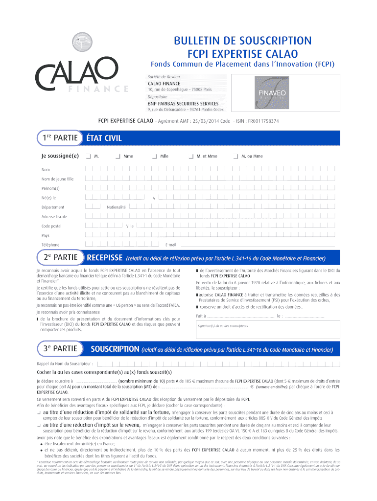BS FCPI -EXPERTISE CALAO-FINAVEO-07/04/14:Mile en page 1 7/04/14 12:58-Page 1 BULLETIN DE SUBSCRIPTION FCPI EXPERTISE CACAO Finds Common de Placement days l Innovation (FCPI) Sci t de Section CACAO