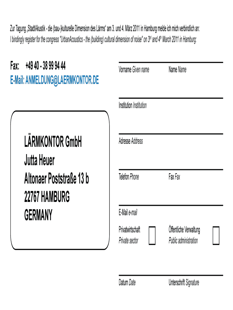 Surname Given name I blindingly register for the congress “UrbanAcoustics — the (building) cultural dimension of noise” on 3 Name Institution