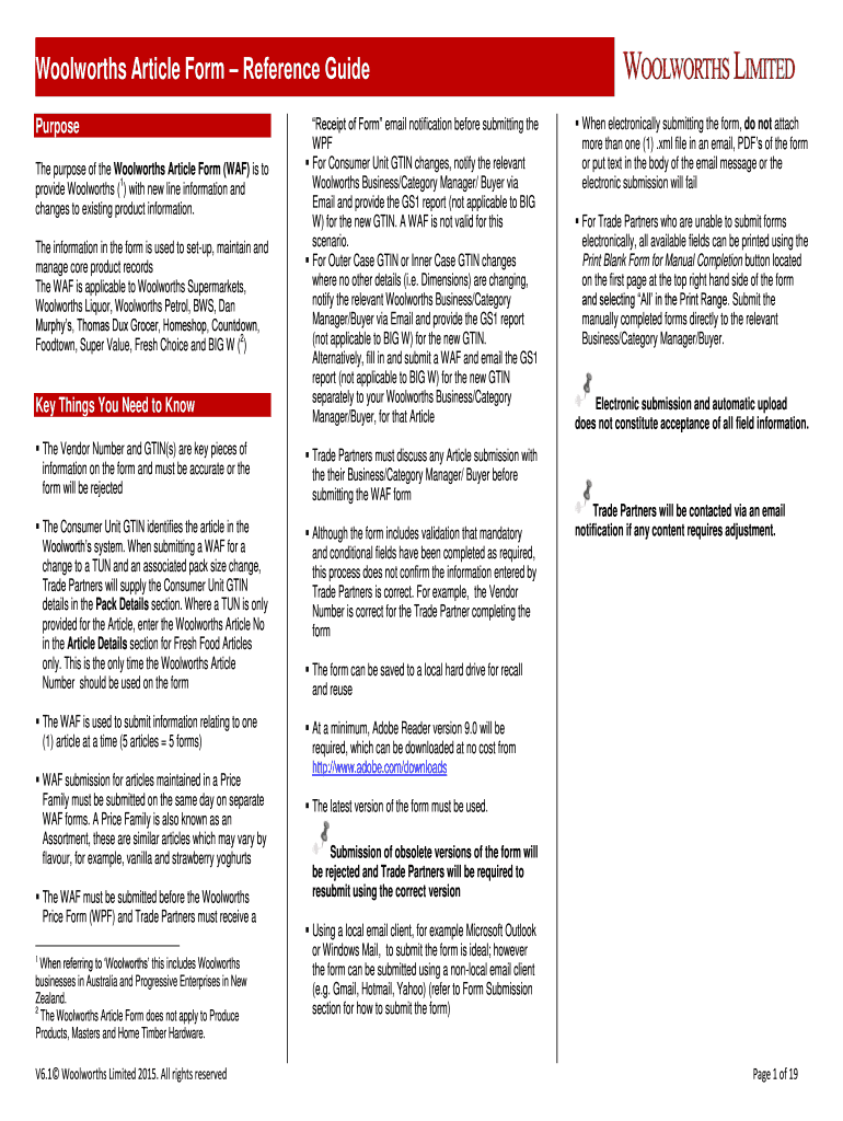 Get the free Woolworths Article Form Reference Guide Purpose The purpose of the Woolworths Articl...