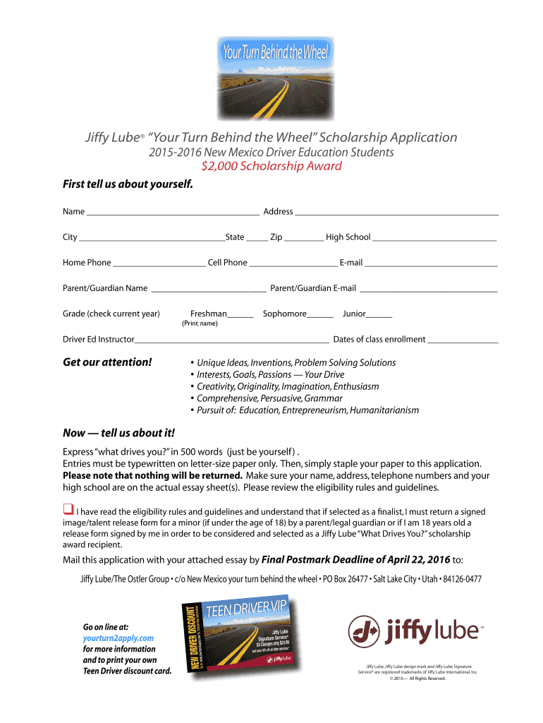Jiffy Lube Your Turn Behind the Wheel Scholarship Application 20152016 New Mexico Driver Education Students $2,000 Scholarship Award First tell us about yourself. Name Address City State Zip High