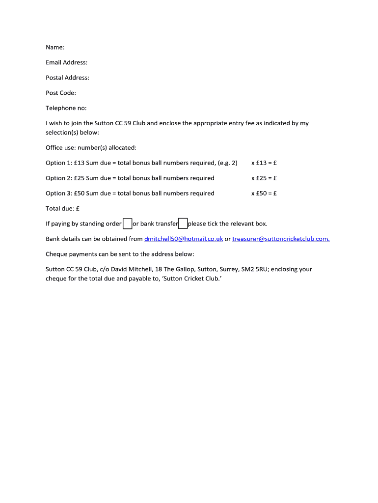 Name: Email Address: Postal Address: Post Code: Telephone no: I wish to join the Sutton CC 59 Club and enclose the appropriate entry fee as indicated by my
