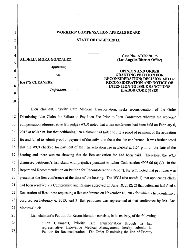 1 WORKERS' COMPENSATION APPEALS BOARD 2 STATE OF CALIFORNIA 3 4 AURELIA MORE GONZALEZ, 5 Case No. ADJ6620175 (Los Angeles District Office) Applicant, 6 vs. 7 KAY'S CLEANERS, 8 Defendant. OPINION AND