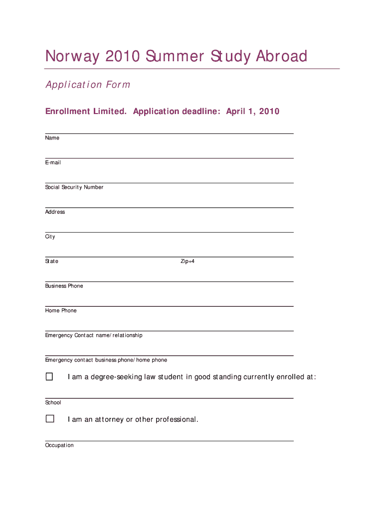 Norway 2010 Summer Study Abroad Application Form Enrollment Limited. Application deadline: April 1, 2010, Name E-mail Social Security Number Address City State Zip+4 Business Phone Home Phone Emergency