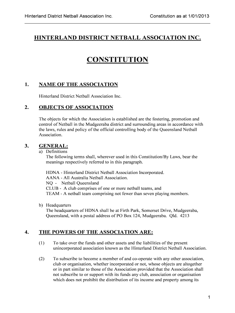 Hinterland District Netball Association Inc. Constitution as at 1/01/2013 HINTERLAND DISTRICT NETBALL ASSOCIATION INC. CONSTITUTION 1. NAME OF THE ASSOCIATION Hinterland District Netball Association