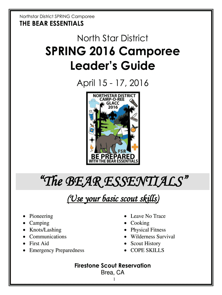 North star District SPRING Jamboree THE BEAR ESSENTIALS North Star District SPRING 2016 Jamboree Leaders Guide April 15 17, 2016 The BEAR ESSENTIALS (Use your basic scout skills) Pioneering Camping
