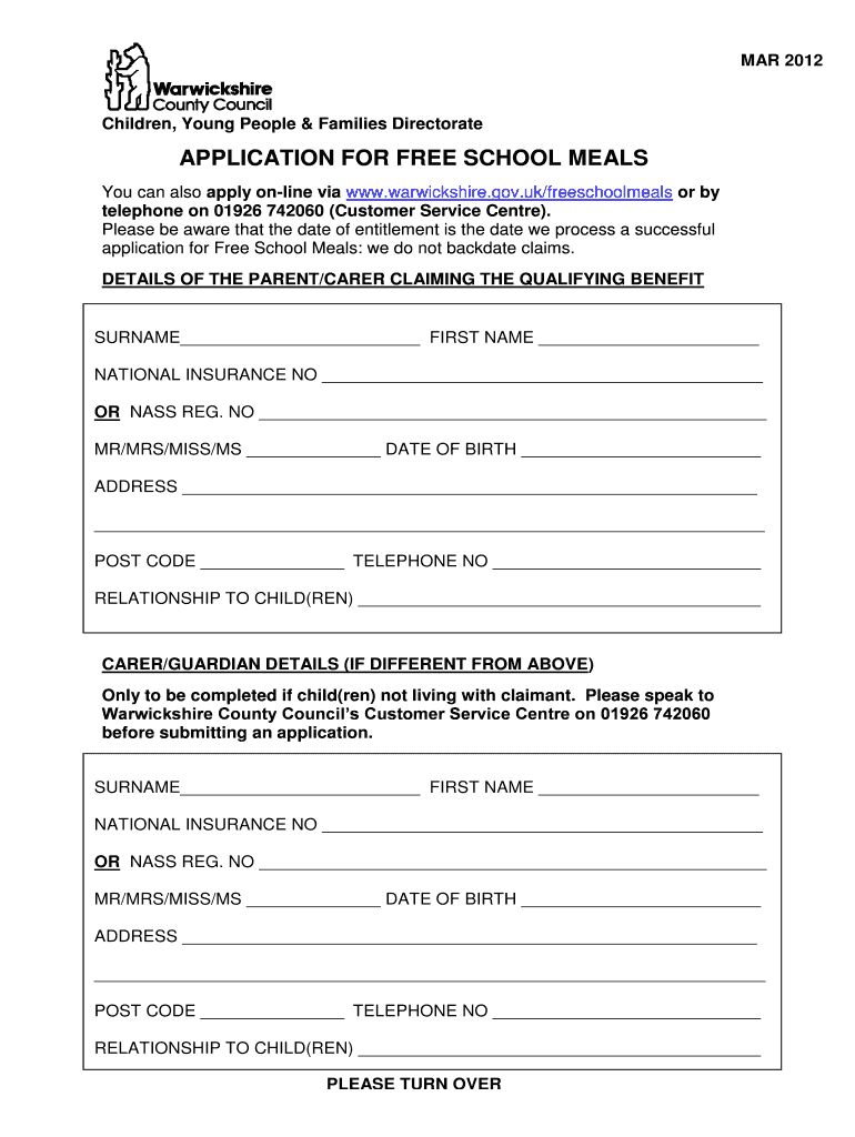 MAR 2012 Children, Young People & Families Directorate APPLICATION FOR FREE SCHOOL MEALS You can also apply on-line via www.warwickshire.gov.uk/freeschoolmeals or by telephone on 01926 742060 (Customer