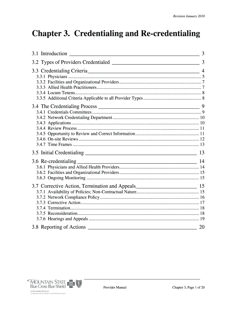 Revision January 2010 Chapter 3. Credentialing and Re credentialing 3.1 Introduction 3 3.2 Types of Providers Credentialed 3 3.3 Credentialing Criteria 4 3.3.1 3.3.2 3.3.3 3.3.4 3.3.5 Physicians .....................................................................................................................