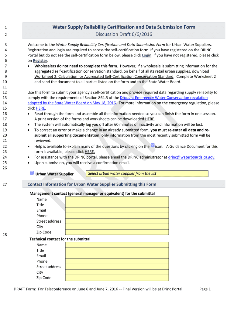 Get the free Water Supply Reliability Certification and Data Submission Form - waterboards ca
