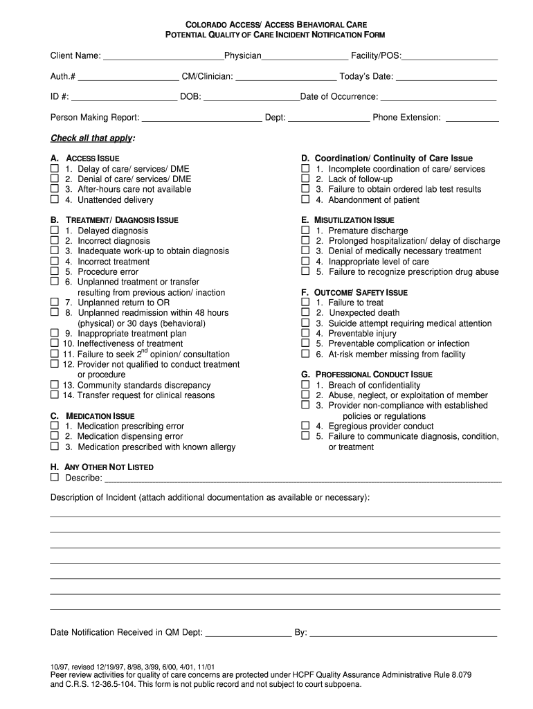 Field-by-Field Instructions for the Colorado Access Behavioral Care Incident Notification Form