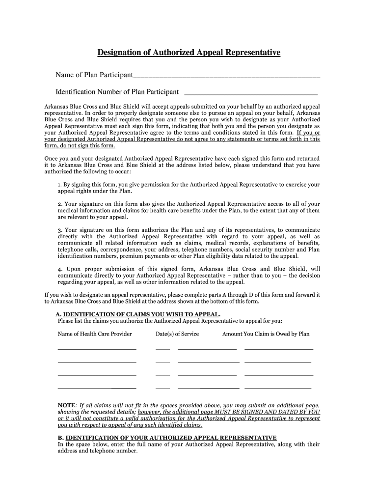 This form is intended for plan participants of Arkansas Blue Cross and Blue Shield who wish to authorize someone else as their representative to appeal claims.