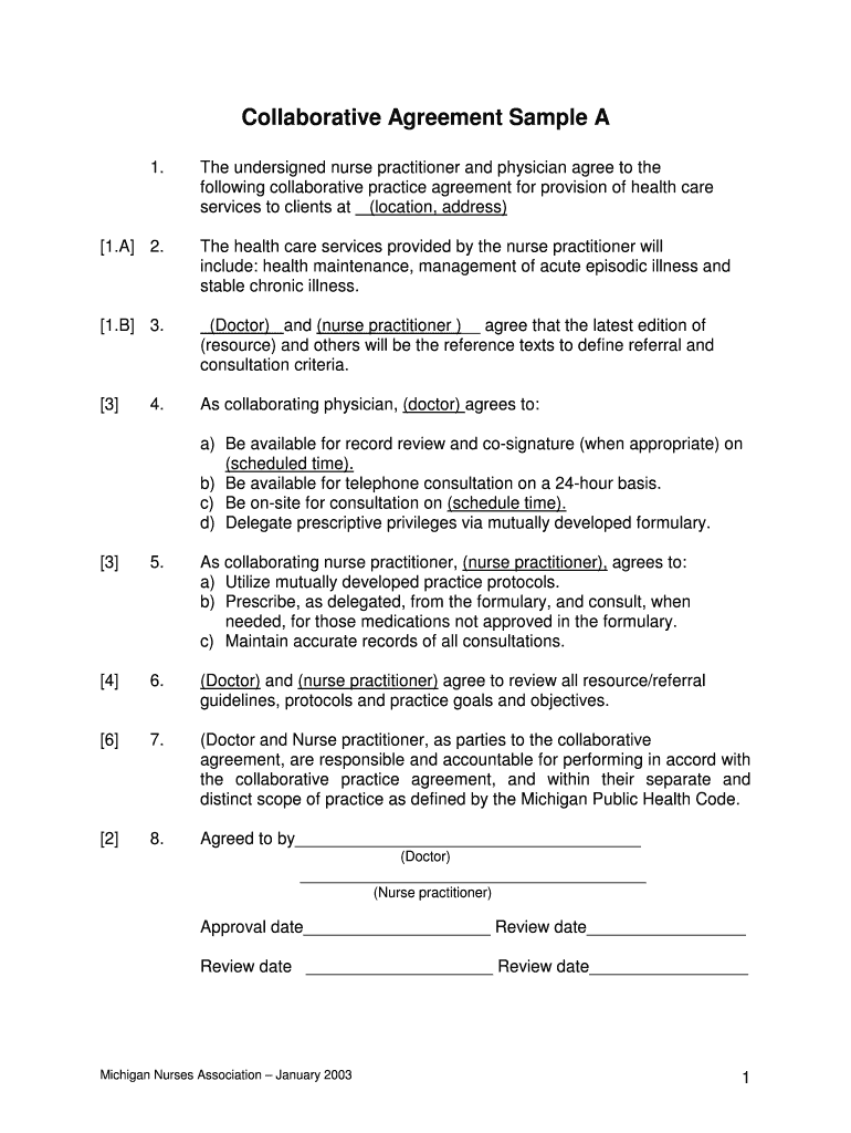 Collaborative Agreement Sample A 1. The undersigned nurse practitioner and physician agree to the following collaborative practice agreement for provision of health care services to clients at (location,