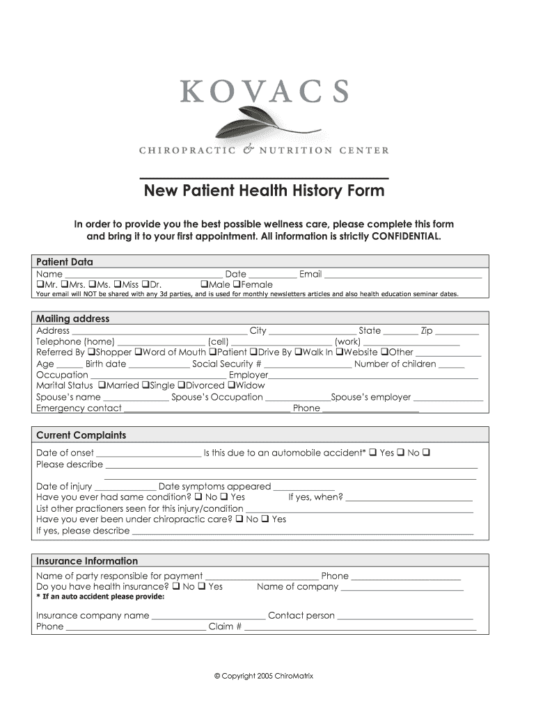 New Patient Health History Form In order to provide you the best possible wellness care, please complete this form and bring it to your first appointment. All information is strictly CONFIDENTIAL.
