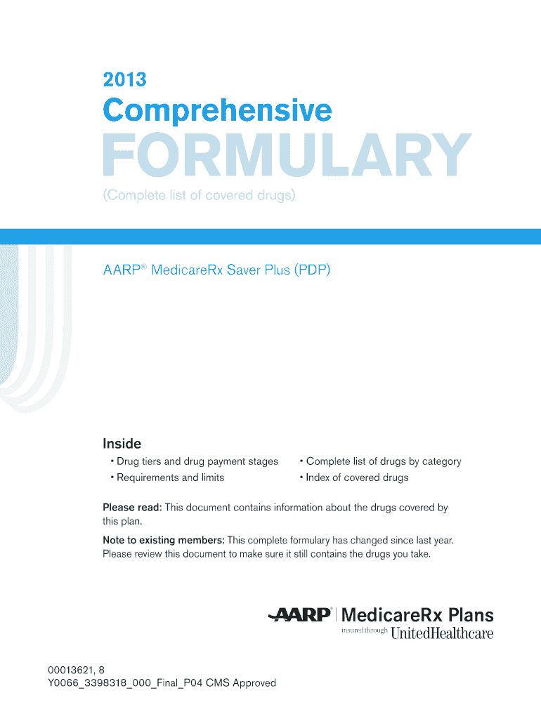 2013ComprehensiveFormulary (Complete list of covered drugs)AARP Medicare Rx Saver Plus (PDP)Inside Drug tiers and drug payment stages Requirements and limits Complete list of drugs by category Index