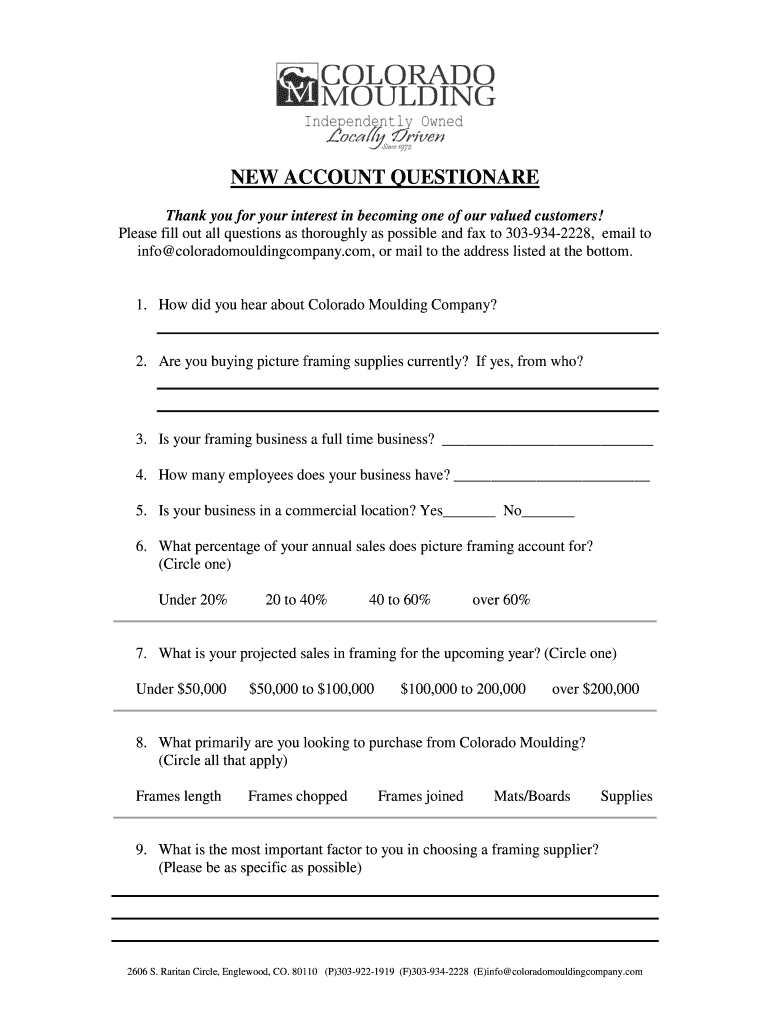 NEW ACCOUNT QUESTION ARE Thank you for your interest in becoming one of our valued customers! Please fill out all questions as thoroughly as possible and fax to 3039342228, email to info coloradomouldingcompany.com,