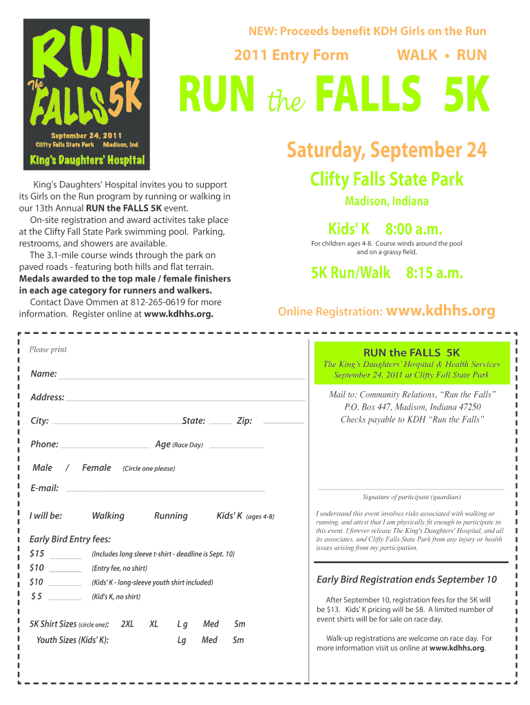 NEW: Proceeds benefit kWh Girls on the Run 2011 Entry Form WALK RUN the FALLS 5K Saturday, September 24 Flighty Falls State Park King's Daughters' Hospital invites you to support its Girls on the