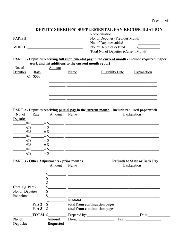 The Deputy Sheriffs' Supplemental Pay Reconciliation Form is a payroll document used by sheriff departments to track and reconcile supplemental pay for deputy sheriffs.