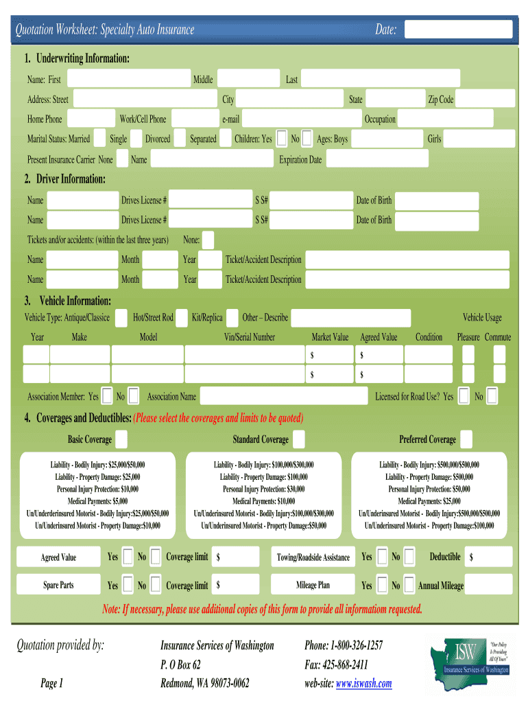 To fill out a quotation worksheet for specialty auto, follow these steps: