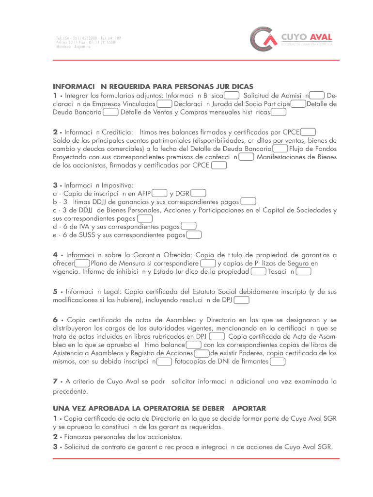 Tel: (54 – 261) 4582000 Fax int: 102 Peatier 50 1 Peso Of. 11 CP. 5500 Mendoza Argentina INFORM ACI N REQUIRED PARA PERSONAS OUR DIAS