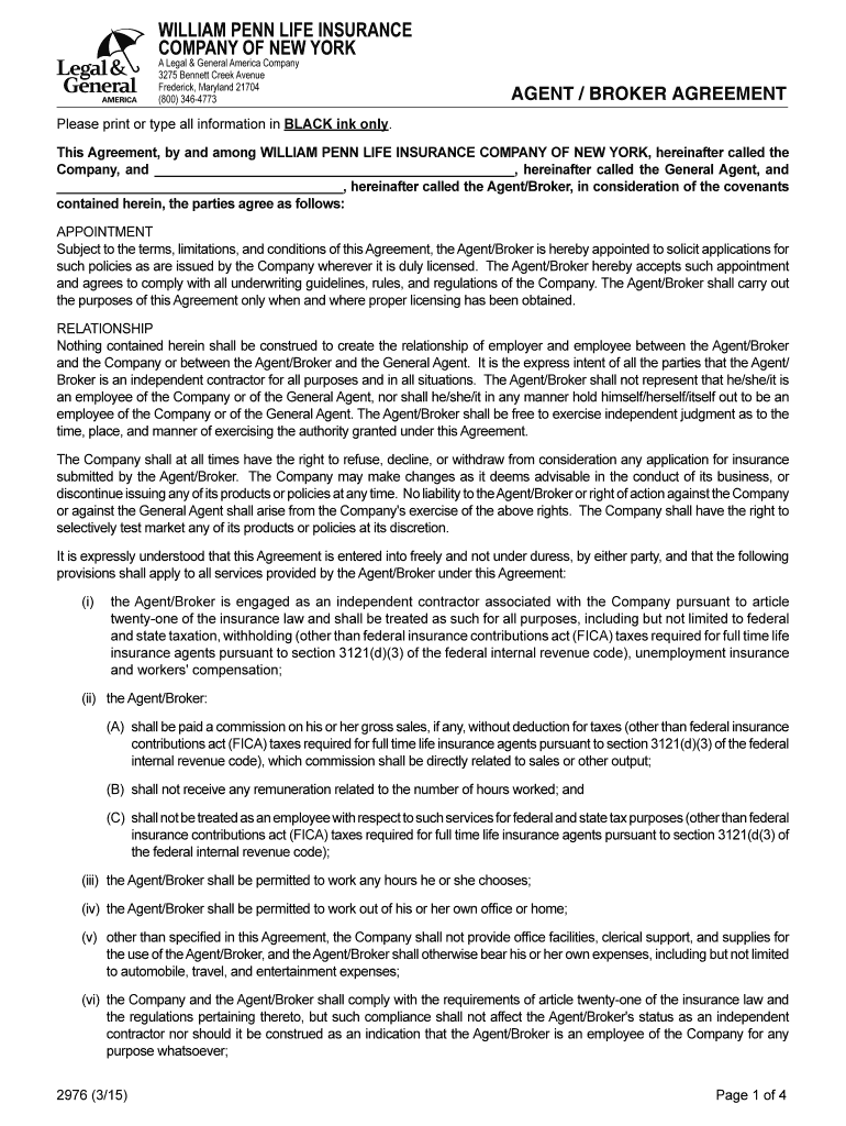 The Agent Broker Agreement must be signed by the independent Agent/Broker seeking to partner with William Penn Life Insurance Company of New York. Eligibility generally requires the agent to hold a valid insurance license.