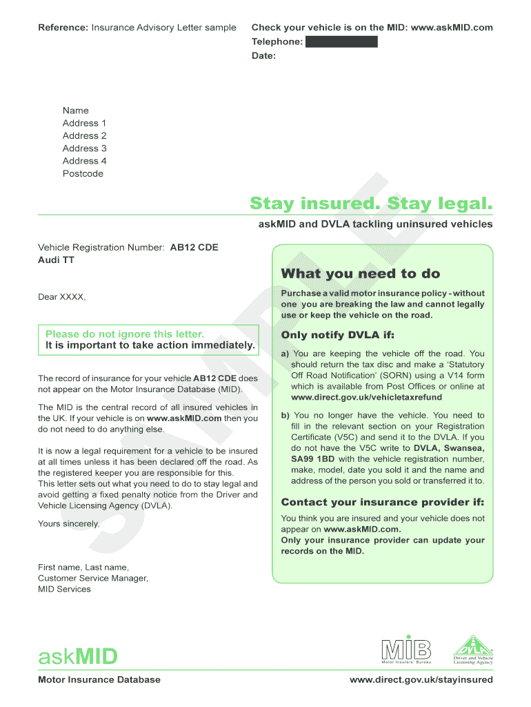 Reference: Insurance Advisory Letter sample Check your vehicle is on the MID: www.askMID.com Telephone: 0845 165 2888 Date: Name Address 1 Address 2 Address 3 Address 4 Postcode E Stay insured. Stay