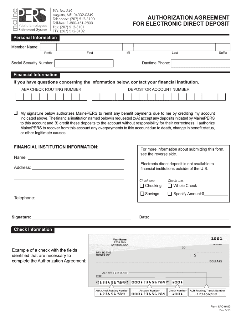 Membership in MainePERS is required to complete the Direct Deposit Authorization. It is specifically for members who receive benefit payments from MainePERS.