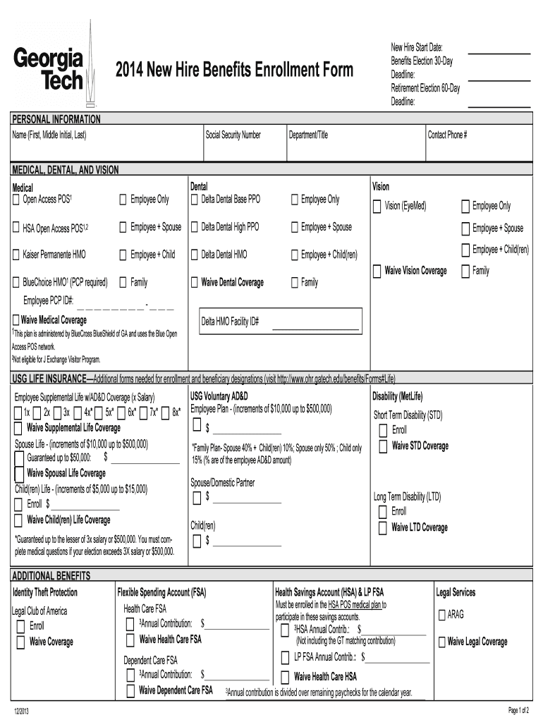 New Hire Start Date: Benefits Election 30Day Deadline: Retirement Election 60Day Deadline: 2014 New Hire Benefits Enrollment Form PERSONAL INFORMATION Name (First, Middle Initial, Last) Social Security