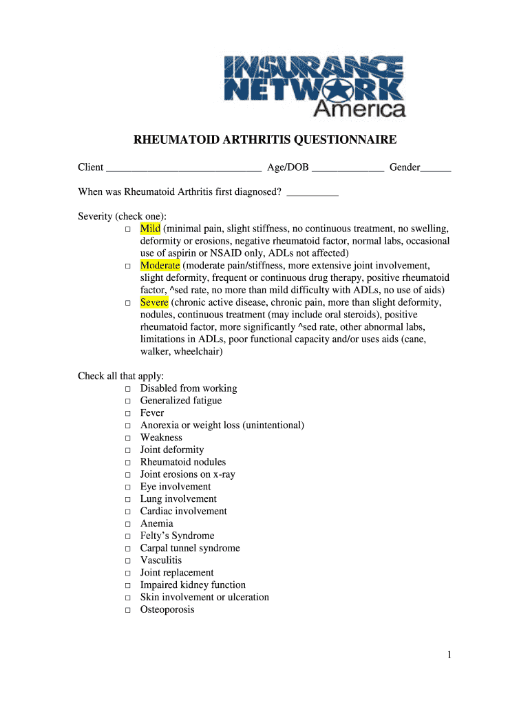 Get the free RHEUMATOID ARTHRITIS QUESTIONNAIRE - Insurance Network America