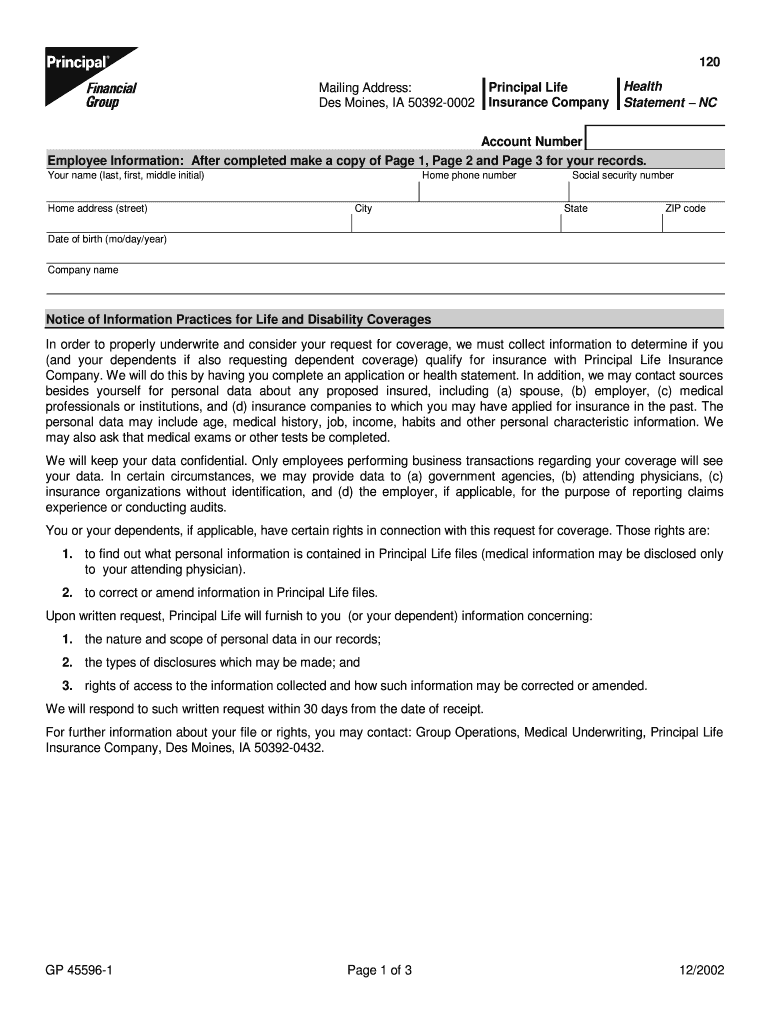 120 Mailing Address: Des Moines, IA 50392-0002 Principal Life Insurance Company Health Statement NC Account Number Employee Information: After completed make a copy of Page 1, Page 2 and Page 3 for