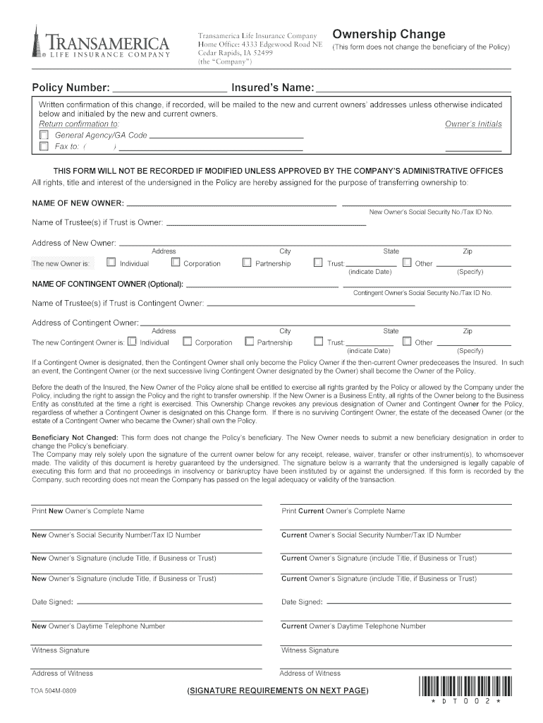 Who Needs the Transamerica Life Insurance Policy Ownership Change Form?
