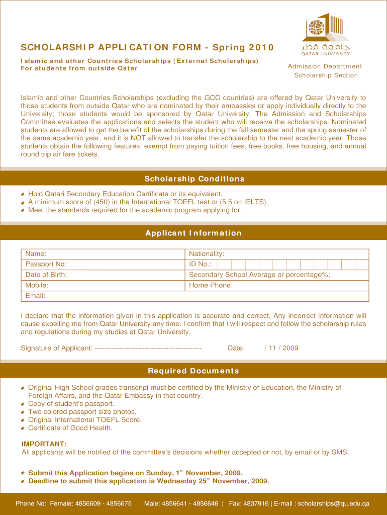 SCHOLARSHIP APPLICATION FORM Spring 2010 Islamic and other Countries Scholarships (External Scholarships) For students from outside Qatar Admission Department Scholarship Section Islamic and other