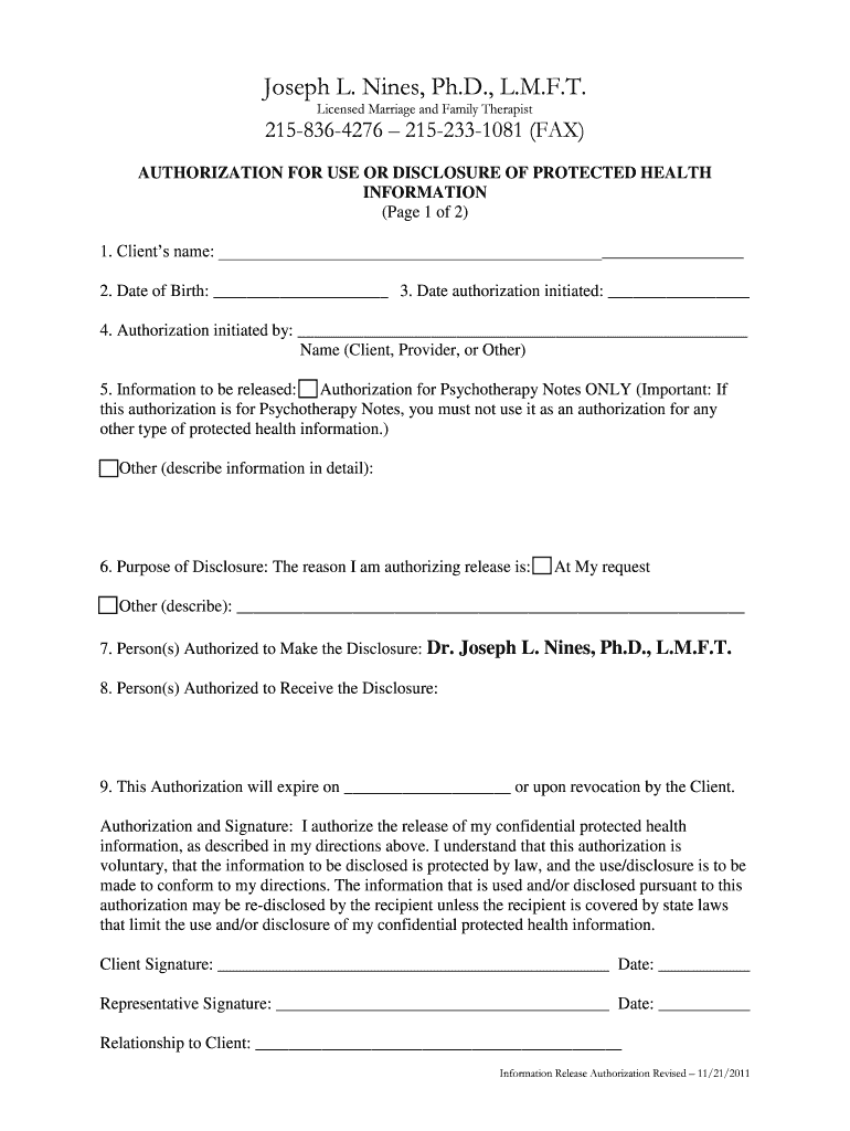 Information Release Authorization Revised 11/21/2011 Joseph L. Nines, Ph.D., L.M.F.T. Licensed Marriage and Family Therapist 215-836-4276 215-233-1081 (FAX)