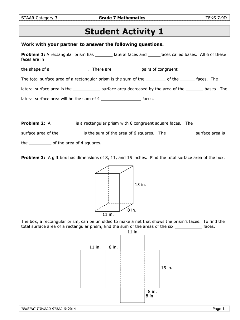STAR Category 3 Grade 7 Mathematics TENS 7.9D Student Activity 1 Work with your partner to answer the following questions. Problem 1: A rectangular prism has lateral faces and faces called bases.