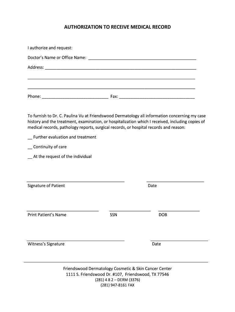 AUTHORIZATION TO RECEIVE MEDICAL RECORD I authorize and request: Doctors Name or Office Name: Address: Phone: Fax: To furnish to Dr. C. Paulina VU at Friends wood Dermatology all information concerning