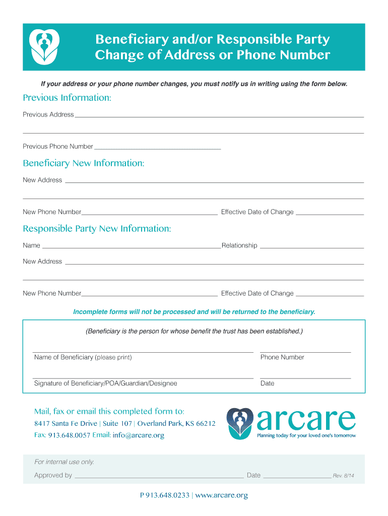 Get the free Beneficiary and/or Responsible Party Change of Address or ... - arcare