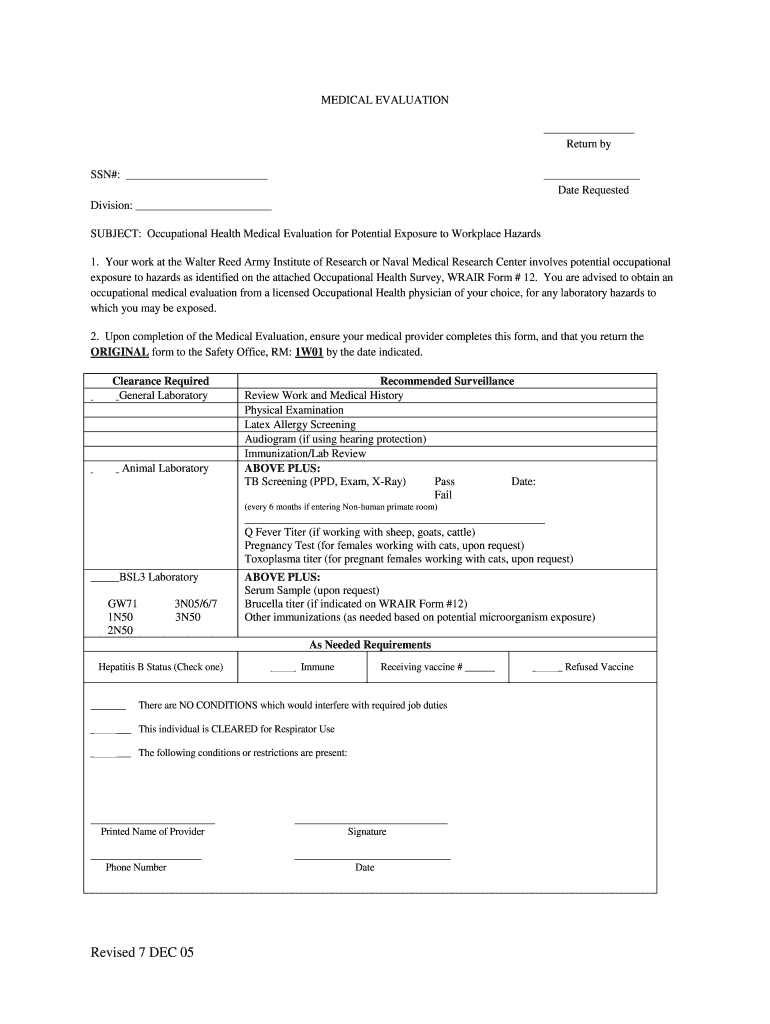 The Occupational Health Medical Evaluation Form serves a crucial purpose in occupational health by providing a structured approach to assessing employee health in relation to workplace hazards. This form is essential for employees in specific settings, especially those at institutions like the Walter Reed Army Institute of Research and the Naval Medical Research Center. It is typically completed by a licensed Occupational Health physician, ensuring that all evaluations meet high medical standards.