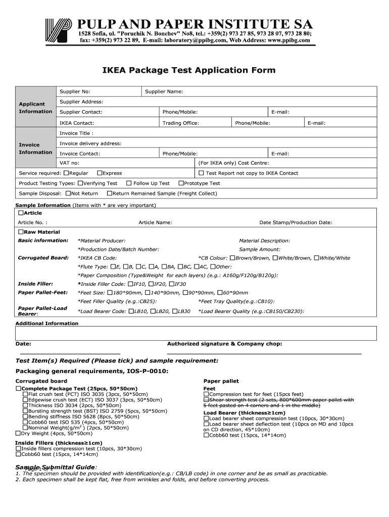 IKEA Package Test Application Form Supplier No: Applicant Information Supplier Name: Supplier Address: Supplier Contact: Phone/Mobile: Email: IKEA Contact: Trading Office: Phone/Mobile: Email: Invoice