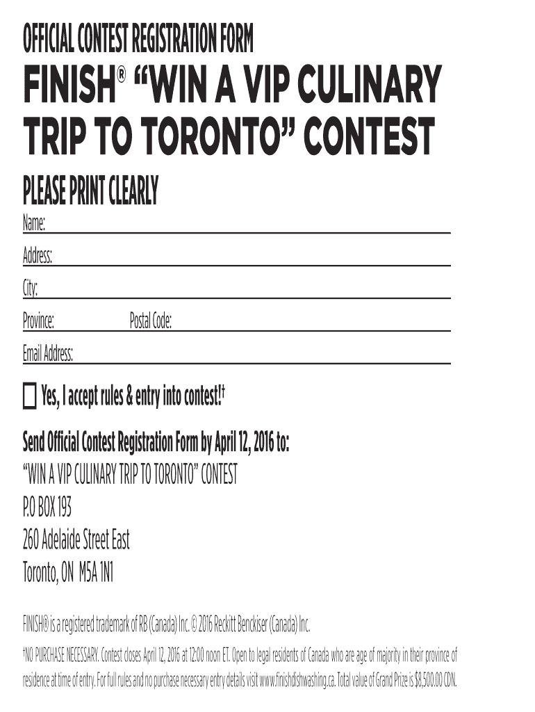 OFFICIAL CONTEST REGISTRATION FORM FINISH WIN A VIP CULINARY TRIP TO TORONTO CONTEST PLEASE PRINT CLEARLY Name: Address: City: Province: Email Address: Postal Code: Yes, I accept rules & entry into