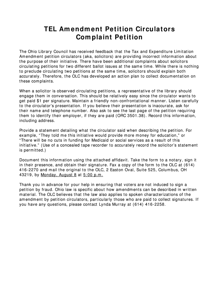 Get the free TEL Amendment Petition Circulators Complaint Petition - olc