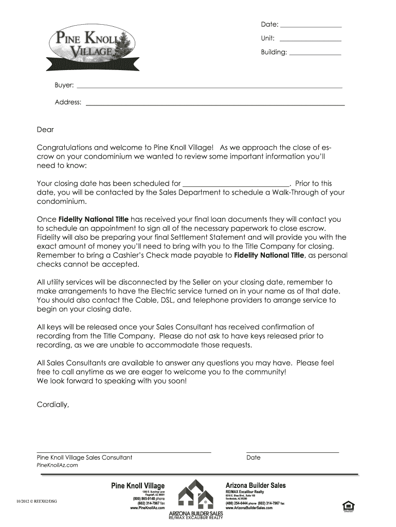 Date: Unit: Building: Buyer: Address: Dear Congratulations and welcome to Pine Knoll Village! As we approach the close of escrow on your condominium we wanted to review some important information