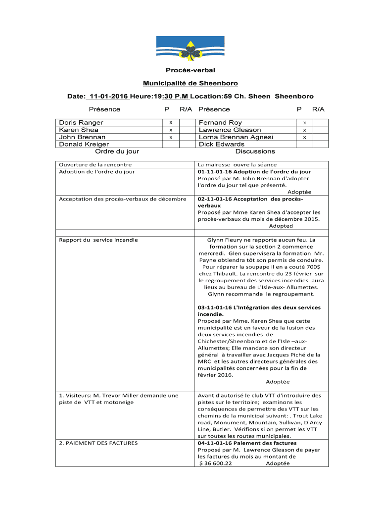 Get the free Procsverbal Municipalit de Sheenboro Date: 11012016 Heure:19:30 P - sheenboro